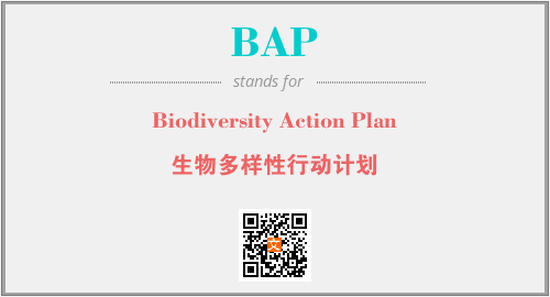 上述内容是“Biodiversity Action Plan”作为“BAP”的缩写,解释为“生物多样性行动计划”时的信息,以及英文缩略词BAP所代表的英文单词,其对应的中文拼音、详细解释以及在英文中的流行度和相关分类、应用领域及应用示例等。