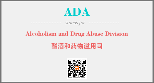 英文缩略词“ADA”经常作为“Alcoholism and Drug Abuse Division”的英文缩写来使用,中文表示:“酗酒和药物滥用司”。本文将详细介绍英文缩写词ADA所代表英文单词,其对应的中文拼音、详细解释以及在英语中的流行度。此外,还有关于缩略词ADA的分类、应用领域及相关应用示例等。