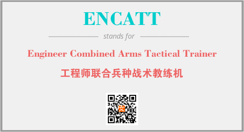 英文缩略词“ENCATT”经常作为“Engineer Combined Arms Tactical Trainer”的英文缩写来使用,中文表示:“工程师联合兵种战术教练机”。本文将详细介绍英文缩写词ENCATT所代表英文单词,其对应的中文拼音、详细解释以及在英语中的流行度。此外,还有关于缩略词ENCATT的分类、应用领域及相关应用示例等。