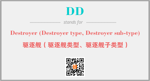 上述内容是“Destroyer (Destroyer type, Destroyer sub-type)”作为“DD”的缩写,解释为“驱逐舰(驱逐舰类型、驱逐舰子类型)”时的信息,以及英文缩略词DD所代表的英文单词,其对应的中文拼音、详细解释以及在英文中的流行度和相关分类、应用领域及应用示例等。