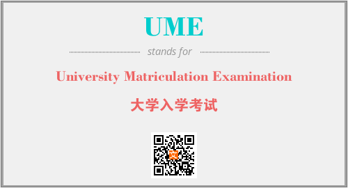 英文缩略词“UME”经常作为“University Matriculation Examination”的英文缩写来使用,中文表示:“大学入学考试”。本文将详细介绍英文缩写词UME所代表英文单词,其对应的中文拼音、详细解释以及在英语中的流行度。此外,还有关于缩略词UME的分类、应用领域及相关应用示例等。