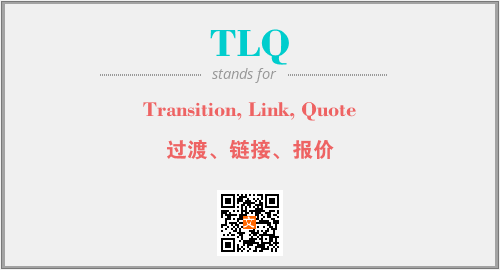 上述内容是“Transition, Link, Quote”作为“TLQ”的缩写,解释为“过渡、链接、报价”时的信息,以及英文缩略词TLQ所代表的英文单词,其对应的中文拼音、详细解释以及在英文中的流行度和相关分类、应用领域及应用示例等。