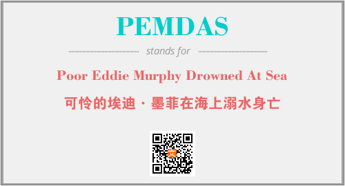 英文缩略词“PEMDAS”经常作为“Poor Eddie Murphy Drowned At Sea”的英文缩写来使用,中文表示:“可怜的埃迪·墨菲在海上溺水身亡”。本文将详细介绍英文缩写词PEMDAS所代表英文单词,其对应的中文拼音、详细解释以及在英语中的流行度。此外,还有关于缩略词PEMDAS的分类、应用领域及相关应用示例等。