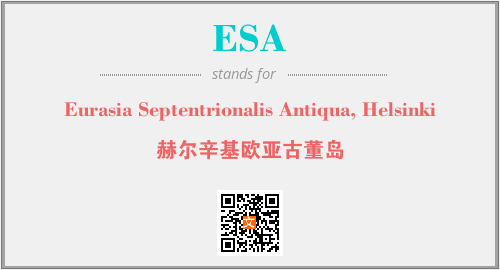 上述内容是“Eurasia Septentrionalis Antiqua, Helsinki”作为“ESA”的缩写,解释为“赫尔辛基欧亚古董岛”时的信息,以及英文缩略词ESA所代表的英文单词,其对应的中文拼音、详细解释以及在英文中的流行度和相关分类、应用领域及应用示例等。