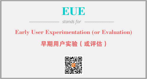 上述内容是“Early User Experimentation (or Evaluation)”作为“EUE”的缩写,解释为“早期用户实验(或评估)”时的信息,以及英文缩略词EUE所代表的英文单词,其对应的中文拼音、详细解释以及在英文中的流行度和相关分类、应用领域及应用示例等。