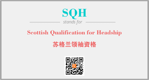 上述内容是“Scottish Qualification for Headship”作为“SQH”的缩写,解释为“苏格兰领袖资格”时的信息,以及英文缩略词SQH所代表的英文单词,其对应的中文拼音、详细解释以及在英文中的流行度和相关分类、应用领域及应用示例等。