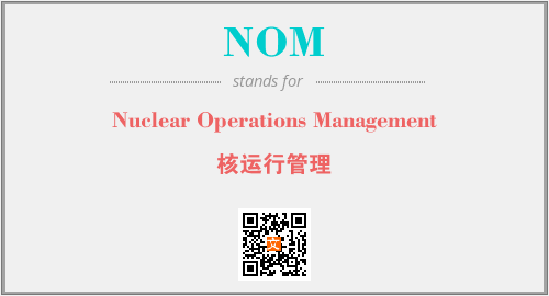英文缩略词“NOM”经常作为“Nuclear Operations Management”的英文缩写来使用,中文表示:“核运行管理”。本文将详细介绍英文缩写词NOM所代表英文单词,其对应的中文拼音、详细解释以及在英语中的流行度。此外,还有关于缩略词NOM的分类、应用领域及相关应用示例等。