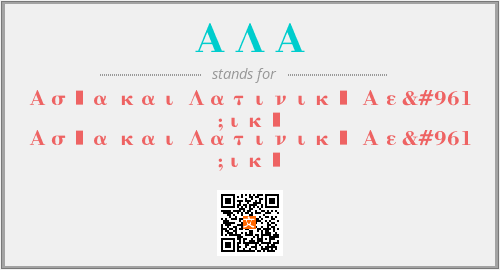 以上为Ασία και Λατινική Αερική英文缩略词ΑΛΑ的中文解释,以及该英文缩写在英语的流行度、分类和应用领域方面的信息。