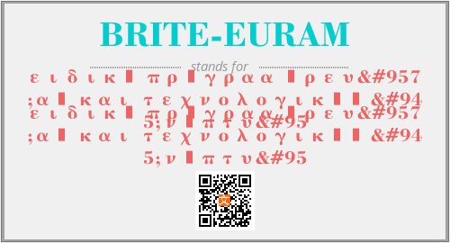 上述内容是“ειδικό πρόγραα έρευνας και τεχνολογικής ανάπτυ_”作为“BRITE-EURAM”的缩写,解释为“ειδικό πρόγραα έρευνας και τεχνολογικής ανάπτυ_”时的信息,以及英文缩略词BRITE-EURAM所代表的英文单词,其对应的中文拼音、详细解释以及在英文中的流行度和相关分类、应用领域及应用示例等。