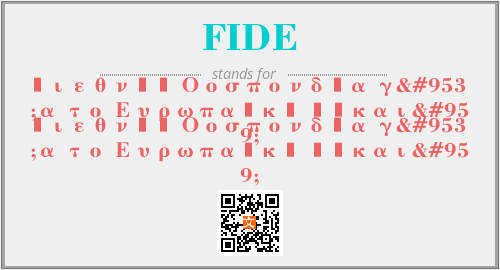 英文缩略词“FIDE”经常作为“∆ιεθνής Οοσπονδία για το Ευρωπαϊκό ∆ίκαιο”的英文缩写来使用,中文表示:“∆ιεθνής Οοσπονδία για το Ευρωπαϊκό ∆ίκαιο”。本文将详细介绍英文缩写词FIDE所代表英文单词,其对应的中文拼音、详细解释以及在英语中的流行度。此外,还有关于缩略词FIDE的分类、应用领域及相关应用示例等。