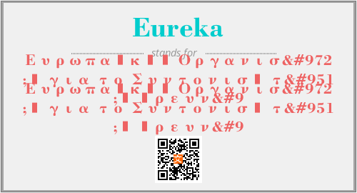 上述内容是“Ευρωπαϊκός Οργανισός για το Συντονισό της Έρευν ”作为“Eureka”的缩写,解释为“Ευρωπαϊκός Οργανισός για το Συντονισό της Έρευν ”时的信息,以及英文缩略词Eureka所代表的英文单词,其对应的中文拼音、详细解释以及在英文中的流行度和相关分类、应用领域及应用示例等。