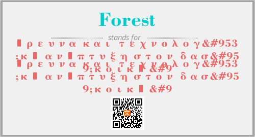 英文缩略词“Forest”经常作为“έρευνα και τεχνολογική ανάπτυξη στον δασοκοικό ”的英文缩写来使用,中文表示:“έρευνα και τεχνολογική ανάπτυξη στον δασοκοικό ”。本文将详细介绍英文缩写词Forest所代表英文单词,其对应的中文拼音、详细解释以及在英语中的流行度。此外,还有关于缩略词Forest的分类、应用领域及相关应用示例等。