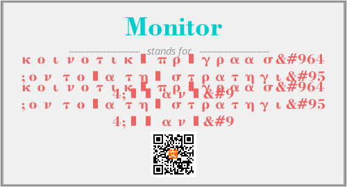 英文缩略词“Monitor”经常作为“κοινοτικό πρόγραα στον τοέα της στρατηγικής ανά ”的英文缩写来使用,中文表示:“κοινοτικό πρόγραα στον τοέα της στρατηγικής ανά ”。本文将详细介绍英文缩写词Monitor所代表英文单词,其对应的中文拼音、详细解释以及在英语中的流行度。此外,还有关于缩略词Monitor的分类、应用领域及相关应用示例等。