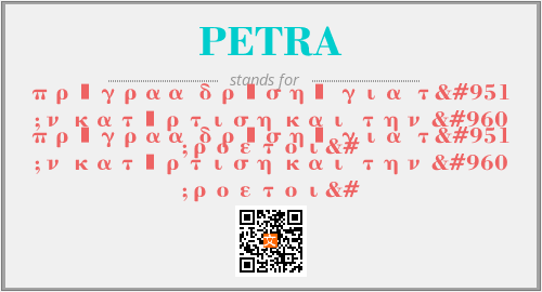 上述内容是“πρόγραα δράσης για την κατάρτιση και την προετοι”作为“PETRA”的缩写,解释为“πρόγραα δράσης για την κατάρτιση και την προετοι”时的信息,以及英文缩略词PETRA所代表的英文单词,其对应的中文拼音、详细解释以及在英文中的流行度和相关分类、应用领域及应用示例等。