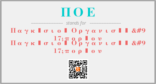 上述内容是“Παγκόσιος Οργανισός Επορίου”作为“ΠΟΕ”的缩写,解释为“Παγκόσιος Οργανισός Επορίου”时的信息,以及英文缩略词ΠΟΕ所代表的英文单词,其对应的中文拼音、详细解释以及在英文中的流行度和相关分类、应用领域及应用示例等。
