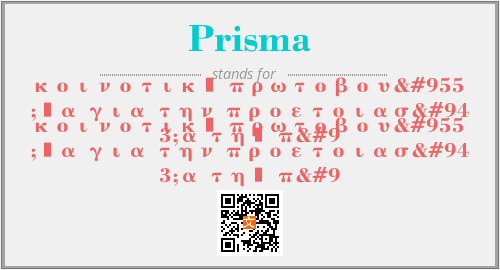 英文缩略词“Prisma”经常作为“κοινοτική πρωτοβουλία για την προετοιασία της π ”的英文缩写来使用,中文表示:“κοινοτική πρωτοβουλία για την προετοιασία της π ”。本文将详细介绍英文缩写词Prisma所代表英文单词,其对应的中文拼音、详细解释以及在英语中的流行度。此外,还有关于缩略词Prisma的分类、应用领域及相关应用示例等。