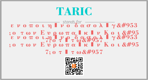 上述内容是“ενοποιηένο δασολόγιο των Ευρωπαϊκών Κοινοτήτων”作为“TARIC”的缩写,解释为“ενοποιηένο δασολόγιο των Ευρωπαϊκών Κοινοτήτων”时的信息,以及英文缩略词TARIC所代表的英文单词,其对应的中文拼音、详细解释以及在英文中的流行度和相关分类、应用领域及应用示例等。