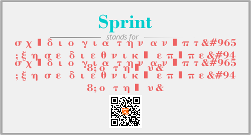 上述内容是“σχέδιο για την ανάπτυξη σε διεθνικό επίπεδο της υ&”作为“Sprint”的缩写,解释为“σχέδιο για την ανάπτυξη σε διεθνικό επίπεδο της υ&”时的信息,以及英文缩略词Sprint所代表的英文单词,其对应的中文拼音、详细解释以及在英文中的流行度和相关分类、应用领域及应用示例等。