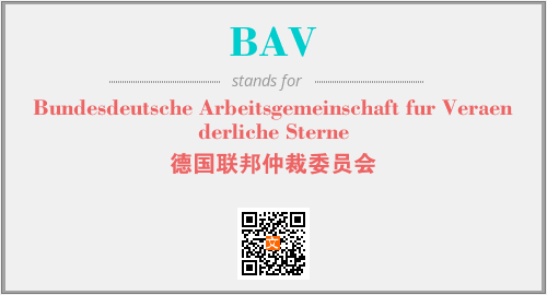 上述内容是“Bundesdeutsche Arbeitsgemeinschaft fur Veraenderliche Sterne”作为“BAV”的缩写,解释为“德国联邦仲裁委员会”时的信息,以及英文缩略词BAV所代表的英文单词,其对应的中文拼音、详细解释以及在英文中的流行度和相关分类、应用领域及应用示例等。