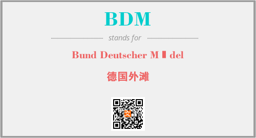 英文缩略词“BDM”经常作为“Bund Deutscher Mädel”的英文缩写来使用,中文表示:“德国外滩”。本文将详细介绍英文缩写词BDM所代表英文单词,其对应的中文拼音、详细解释以及在英语中的流行度。此外,还有关于缩略词BDM的分类、应用领域及相关应用示例等。