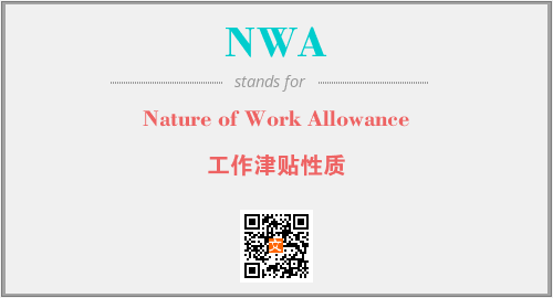 英文缩略词“NWA”经常作为“Nature of Work Allowance”的英文缩写来使用,中文表示:“工作津贴性质”。本文将详细介绍英文缩写词NWA所代表英文单词,其对应的中文拼音、详细解释以及在英语中的流行度。此外,还有关于缩略词NWA的分类、应用领域及相关应用示例等。