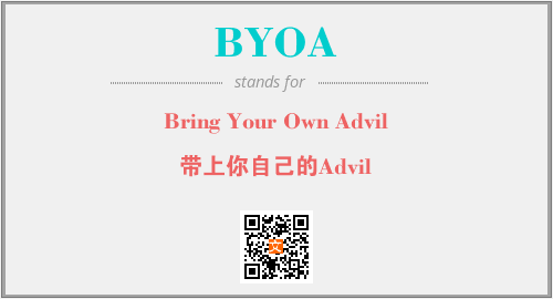 以上为Bring Your Own Advil英文缩略词BYOA的中文解释,以及该英文缩写在英语的流行度、分类和应用领域方面的信息。