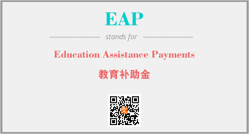 英文缩略词“EAP”经常作为“Education Assistance Payments”的英文缩写来使用,中文表示:“教育补助金”。本文将详细介绍英文缩写词EAP所代表英文单词,其对应的中文拼音、详细解释以及在英语中的流行度。此外,还有关于缩略词EAP的分类、应用领域及相关应用示例等。