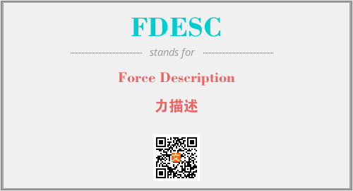英文缩略词“FDESC”经常作为“Force Description”的英文缩写来使用,中文表示:“力描述”。本文将详细介绍英文缩写词FDESC所代表英文单词,其对应的中文拼音、详细解释以及在英语中的流行度。此外,还有关于缩略词FDESC的分类、应用领域及相关应用示例等。