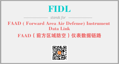 上述内容是“FAAD ( Forward Area Air Defense) Instrument Data Link”作为“FIDL”的缩写,解释为“FAAD(前方区域防空)仪表数据链路”时的信息,以及英文缩略词FIDL所代表的英文单词,其对应的中文拼音、详细解释以及在英文中的流行度和相关分类、应用领域及应用示例等。