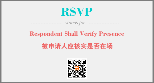 上述内容是“Respondent Shall Verify Presence”作为“RSVP”的缩写,解释为“被申请人应核实是否在场”时的信息,以及英文缩略词RSVP所代表的英文单词,其对应的中文拼音、详细解释以及在英文中的流行度和相关分类、应用领域及应用示例等。