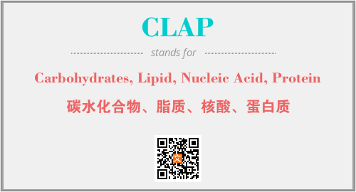 上述内容是“Carbohydrates, Lipid, Nucleic Acid, Protein”作为“CLAP”的缩写,解释为“碳水化合物、脂质、核酸、蛋白质”时的信息,以及英文缩略词CLAP所代表的英文单词,其对应的中文拼音、详细解释以及在英文中的流行度和相关分类、应用领域及应用示例等。