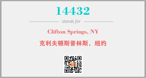 上述内容是“Clifton Springs, NY”作为“14432”的缩写,解释为“克利夫顿斯普林斯,纽约”时的信息,以及英文缩略词14432所代表的英文单词,其对应的中文拼音、详细解释以及在英文中的流行度和相关分类、应用领域及应用示例等。