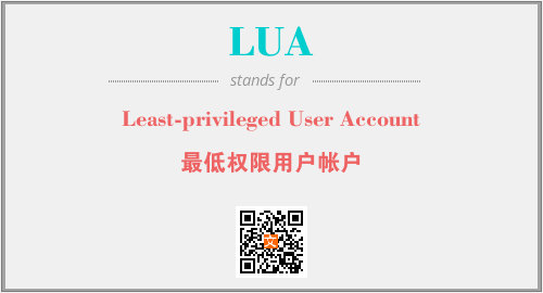 上述内容是“Least-privileged User Account”作为“LUA”的缩写,解释为“最低权限用户帐户”时的信息,以及英文缩略词LUA所代表的英文单词,其对应的中文拼音、详细解释以及在英文中的流行度和相关分类、应用领域及应用示例等。