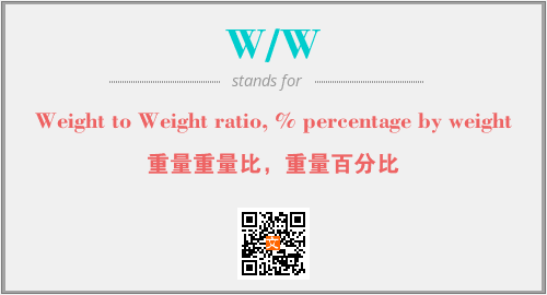 上述内容是“Weight to Weight ratio, % percentage by weight”作为“W/W”的缩写,解释为“重量重量比,重量百分比”时的信息,以及英文缩略词W/W所代表的英文单词,其对应的中文拼音、详细解释以及在英文中的流行度和相关分类、应用领域及应用示例等。