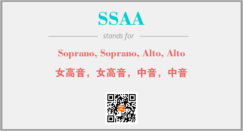 英文缩略词“SSAA”经常作为“Soprano, Soprano, Alto, Alto”的英文缩写来使用,中文表示:“女高音,女高音,中音,中音”。本文将详细介绍英文缩写词SSAA所代表英文单词,其对应的中文拼音、详细解释以及在英语中的流行度。此外,还有关于缩略词SSAA的分类、应用领域及相关应用示例等。