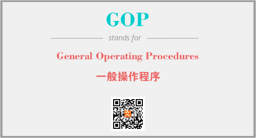 英文缩略词“GOP”经常作为“General Operating Procedures”的英文缩写来使用,中文表示:“一般操作程序”。本文将详细介绍英文缩写词GOP所代表英文单词,其对应的中文拼音、详细解释以及在英语中的流行度。此外,还有关于缩略词GOP的分类、应用领域及相关应用示例等。