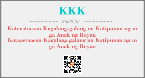 英文缩略词“KKK”经常作为“Kataastaasan Kagalang-galang na Katipunan ng mga Anak ng Bayan”的英文缩写来使用,中文表示:“Kataastaasan Kagalang galang na Katipunan ng mga Anak ng Bayan”。本文将详细介绍英文缩写词KKK所代表英文单词,其对应的中文拼音、详细解释以及在英语中的流行度。此外,还有关于缩略词KKK的分类、应用领域及相关应用示例等。