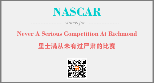 上述内容是“Never A Serious Competition At Richmond”作为“NASCAR”的缩写,解释为“里士满从未有过严肃的比赛”时的信息,以及英文缩略词NASCAR所代表的英文单词,其对应的中文拼音、详细解释以及在英文中的流行度和相关分类、应用领域及应用示例等。