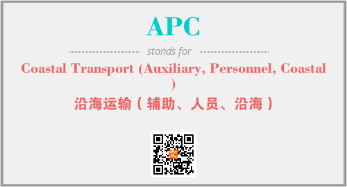 上述内容是“Coastal Transport (Auxiliary, Personnel, Coastal)”作为“APC”的缩写,解释为“沿海运输(辅助、人员、沿海)”时的信息,以及英文缩略词APC所代表的英文单词,其对应的中文拼音、详细解释以及在英文中的流行度和相关分类、应用领域及应用示例等。