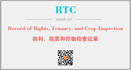 上述内容是“Record of Rights, Tenancy, and Crop Inspection”作为“RTC”的缩写,解释为“权利、租赁和作物检查记录”时的信息,以及英文缩略词RTC所代表的英文单词,其对应的中文拼音、详细解释以及在英文中的流行度和相关分类、应用领域及应用示例等。