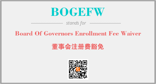 上述内容是“Board Of Governors Enrollment Fee Waiver”作为“BOGEFW”的缩写,解释为“董事会注册费豁免”时的信息,以及英文缩略词BOGEFW所代表的英文单词,其对应的中文拼音、详细解释以及在英文中的流行度和相关分类、应用领域及应用示例等。