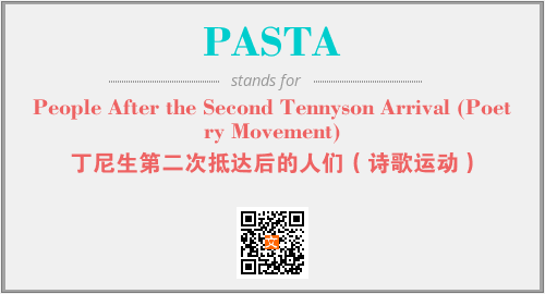 以上为People After the Second Tennyson Arrival (Poetry Movement)英文缩略词PASTA的中文解释,以及该英文缩写在英语的流行度、分类和应用领域方面的信息。