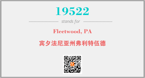 上述内容是“Fleetwood, PA”作为“19522”的缩写,解释为“宾夕法尼亚州弗利特伍德”时的信息,以及英文缩略词19522所代表的英文单词,其对应的中文拼音、详细解释以及在英文中的流行度和相关分类、应用领域及应用示例等。