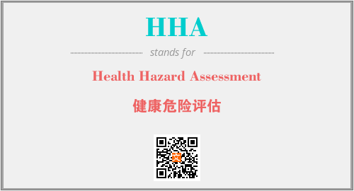 英文缩略词“HHA”经常作为“Health Hazard Assessment”的英文缩写来使用,中文表示:“健康危险评估”。本文将详细介绍英文缩写词HHA所代表英文单词,其对应的中文拼音、详细解释以及在英语中的流行度。此外,还有关于缩略词HHA的分类、应用领域及相关应用示例等。