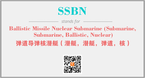 上述内容是“Ballistic Missile Nuclear Submarine (Submarine, Submarine, Ballistic, Nuclear)”作为“SSBN”的缩写,解释为“弹道导弹核潜艇(潜艇,潜艇,弹道,核)”时的信息,以及英文缩略词SSBN所代表的英文单词,其对应的中文拼音、详细解释以及在英文中的流行度和相关分类、应用领域及应用示例等。