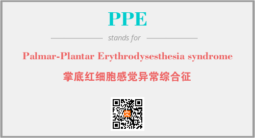 上述内容是“Palmar-Plantar Erythrodysesthesia syndrome”作为“PPE”的缩写,解释为“掌底红细胞感觉异常综合征”时的信息,以及英文缩略词PPE所代表的英文单词,其对应的中文拼音、详细解释以及在英文中的流行度和相关分类、应用领域及应用示例等。