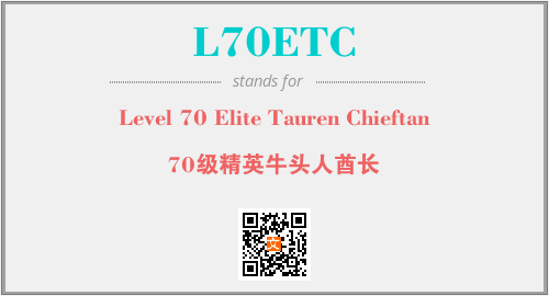 英文缩略词“L70ETC”经常作为“Level 70 Elite Tauren Chieftan”的英文缩写来使用,中文表示:“70级精英牛头人酋长”。本文将详细介绍英文缩写词L70ETC所代表英文单词,其对应的中文拼音、详细解释以及在英语中的流行度。此外,还有关于缩略词L70ETC的分类、应用领域及相关应用示例等。