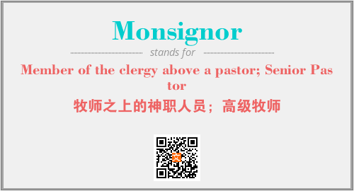 英文缩略词“Monsignor”经常作为“Member of the clergy above a pastor; Senior Pastor”的英文缩写来使用,中文表示:“牧师之上的神职人员;高级牧师”。本文将详细介绍英文缩写词Monsignor所代表英文单词,其对应的中文拼音、详细解释以及在英语中的流行度。此外,还有关于缩略词Monsignor的分类、应用领域及相关应用示例等。