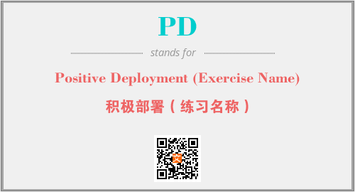 上述内容是“Positive Deployment (Exercise Name)”作为“PD”的缩写,解释为“积极部署(练习名称)”时的信息,以及英文缩略词PD所代表的英文单词,其对应的中文拼音、详细解释以及在英文中的流行度和相关分类、应用领域及应用示例等。