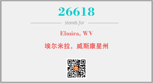 上述内容是“Elmira, WV”作为“26618”的缩写,解释为“埃尔米拉,威斯康星州”时的信息,以及英文缩略词26618所代表的英文单词,其对应的中文拼音、详细解释以及在英文中的流行度和相关分类、应用领域及应用示例等。